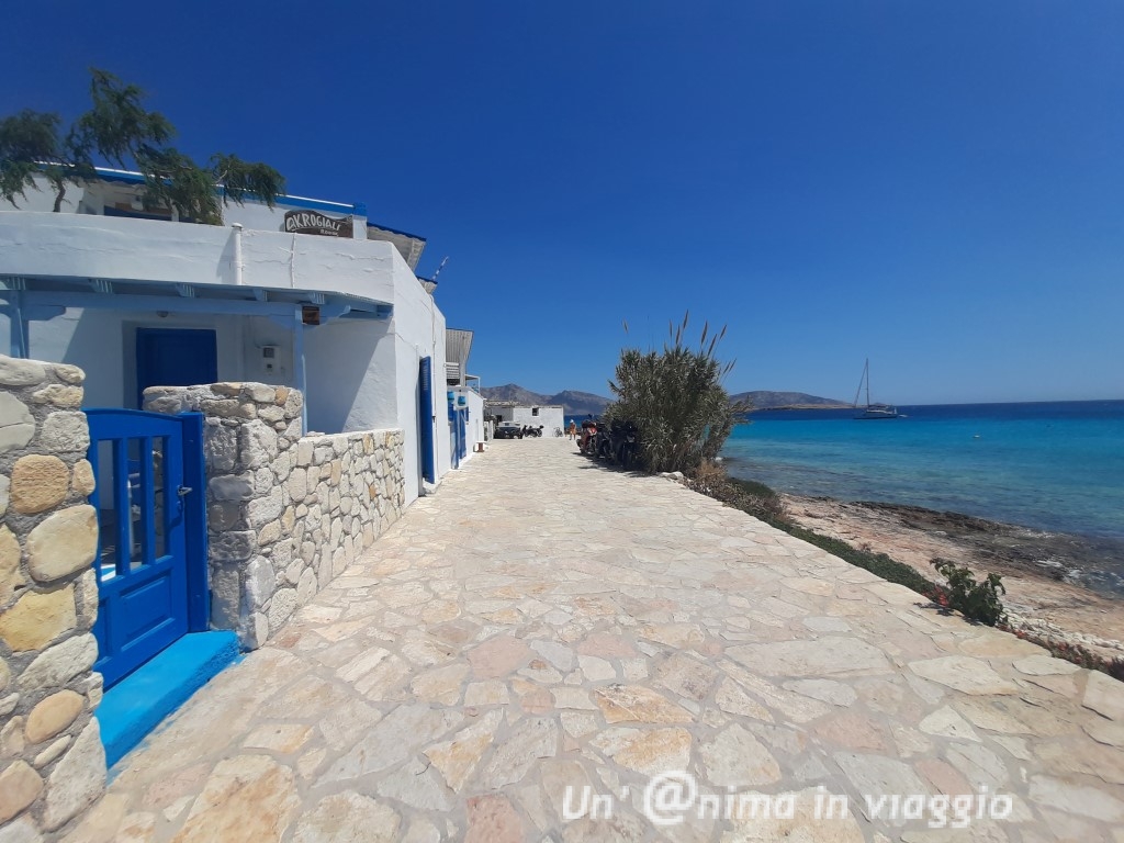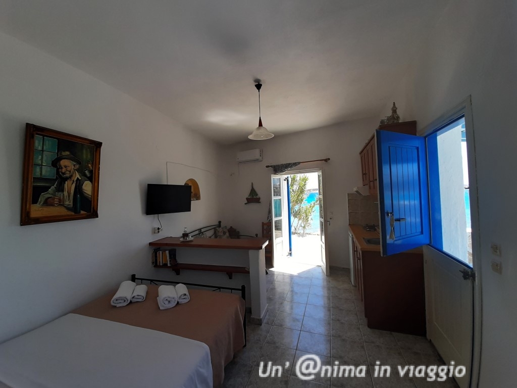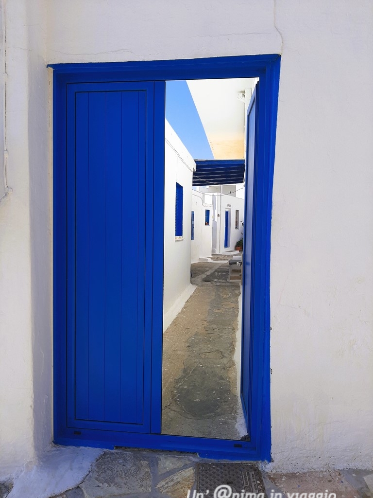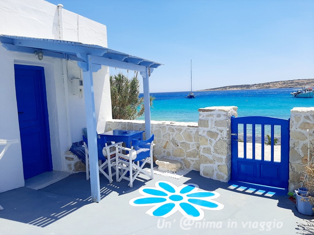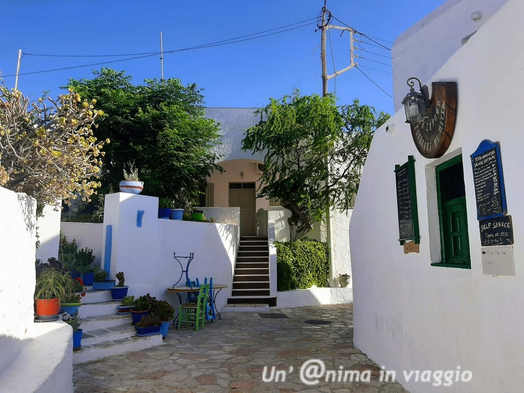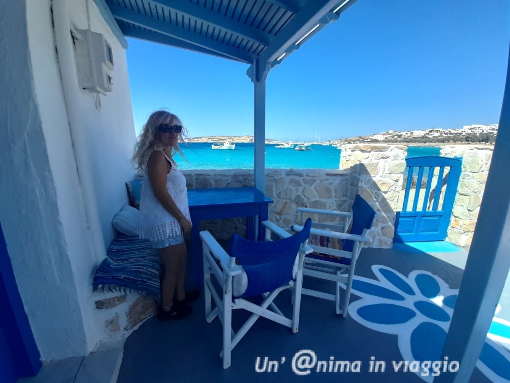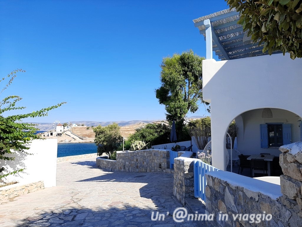 Girando comunque abbiamo visto tanti alloggi davvero belli: ci sono pochi hotel e tante casette o studios, alcuni in spettacolare posizione vista mare.. che vorresti provarli tutti!! Il mio suggerimento è di cercare qualcosa non troppo lontano dalla chora, e vista mare, in modo che, in caso di vento forte, o di difficoltà a stare sotto il sole, si possa avere rifugio, magari in un patio all’ombra, e per godersi a pieno l’incanto dell’isola