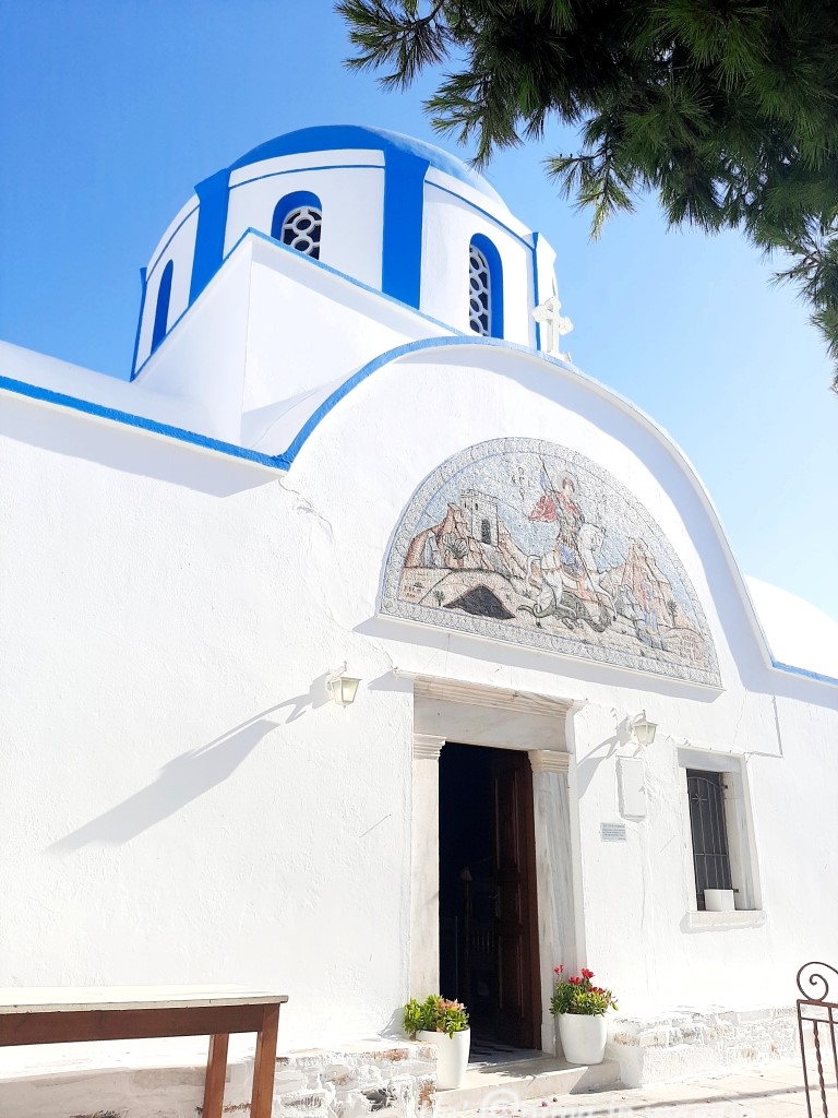 La chora, ovvero il centro del paese resta su una collinetta, si accede quindi da una stradina in salita, ed è bella, ordinata ed elegante, con la classica pavimentazione in porfido grigio bordato di bianco. Le case sono bianche con porte e finestre colorate, prevalentemente di blu