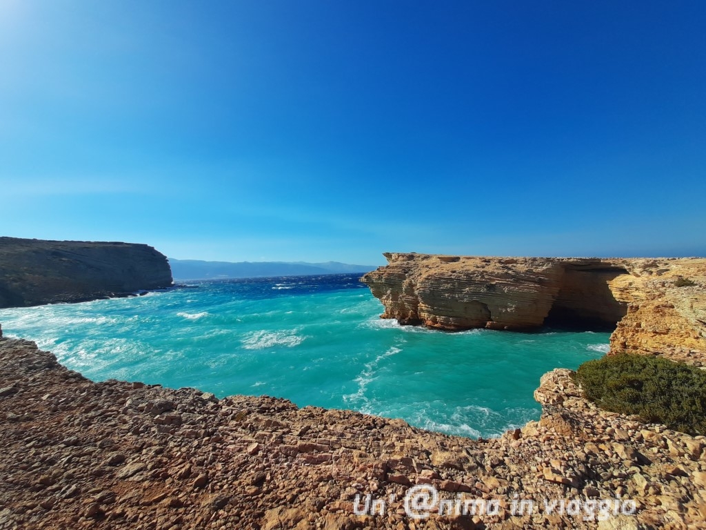 Quando l’ho vista dall’alto, mi sono subito innamorata della sua scogliera rossastra e dorata, selvaggia, e del mare verde che la lambisce. Per raggiungerla occorre lasciare l’auto sulla strada, camminare in mezzo alla vegetazione bassa, e scendere da un canyon, dove è stato ricavato un sentiero