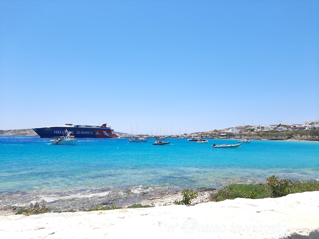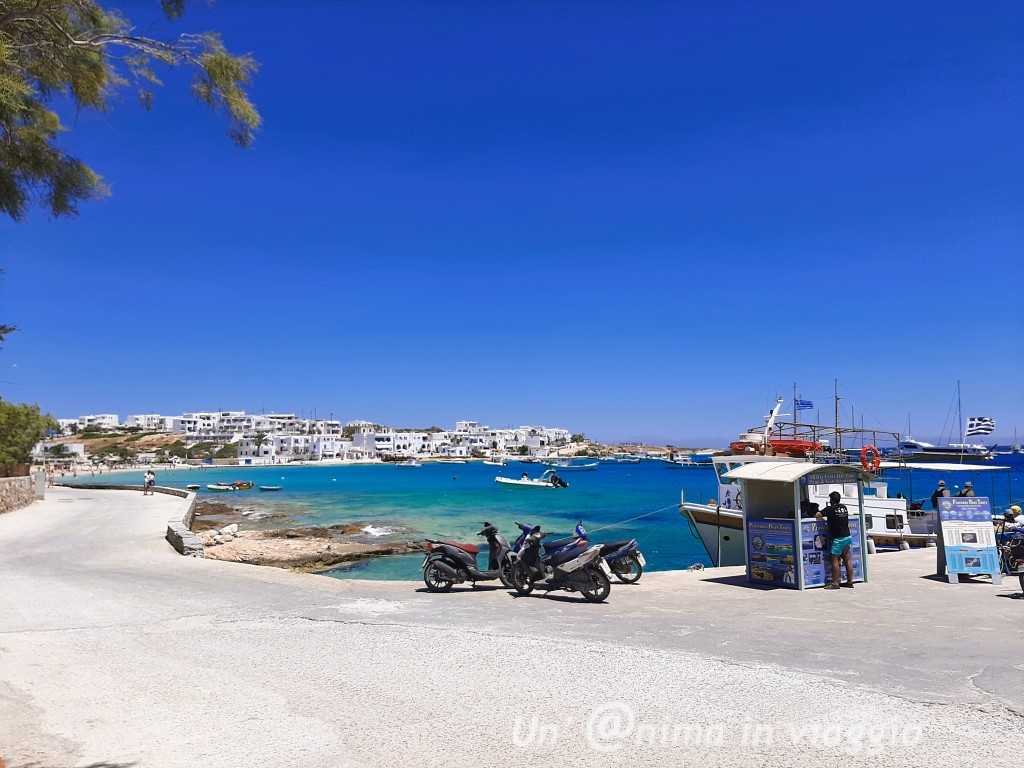 Poichè anche il primo traghetto in partenza è in ritardo, ci sediamo in un bar attiguo alla biglietteria, che già ha l’atmosfera greca: c’è un bel venticello fresco che da sollievo dalla forte calura. La zona di partenza dei traghetti è ben organizzata, ci sono ampi spazi al coperto con aria condizionata, e posti a sedere per attendere, e taverne dove bere o mangiare qualcosa. Ci prendiamo qualcosa da bere e, durante l’attesa, prenotiamo anche l’alloggio per la notte: scegliamo di stare alla chora, cioè nel centro di Naxos, così la vedremo di sera e l’indomani mattina, prima di prendere la macchina noleggiata, e di recarci a Plaka, dove abbiamo l’alloggio per i seguenti giorni.