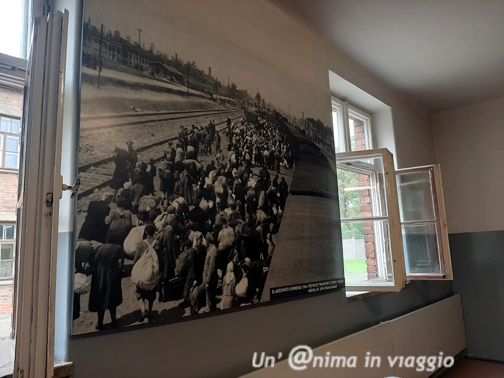 In silenzio, percorriamo la strada sterrata, guardandoci attorno, la stessa che facevano i prigionieri: noi sappiamo cosa ci aspetta, loro erano ignari e provati da un viaggio già massacrante e umiliante, stipati nei carri ferroviari come bestie; fino ad arrivare ad un vagone, nel punto esatto dove l’ufficiale medico delle SS, guardando le persone arrivate, faceva la selezione, decidendo chi doveva andare da una parte, e chi dall’altra: da un lato venivano mandati coloro che apparivano in salute per lavorare, dall’altro i più fragili, anziani, bambini e malati, condannati subito alle camere a gas