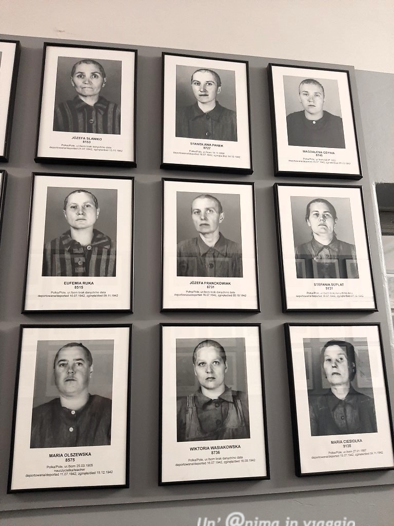 Sulla parete di sinistra, volti di donne, le prime coi capelli, le successive con la testa rasata. Sulla destra gli uomini, tutti rasati, stessa uniforme. E mentre nelle donne scorgo uno sguardo pieno di tristezza e rassegnazione, degli uomini mi impressionano i loro occhi sbarrati, in cui leggo il terrore.