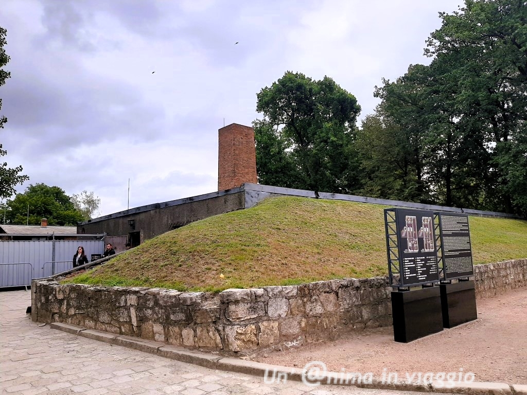 Poco oltre, sotto una collinetta dove si scorge una ciminiera, entrando da una inquietante porta, si arriva negli ambienti dove dicevano li portassero a fare la doccia: loro ci credevano, li facevano spogliare tutti, completamente, però ad uscire dai buchi, visibili sul soffitto, non era l’acqua per lavarsi, ma lo Zyklon B, un gas che uccide per soffocamento. Le luci spente, in modo che l’angoscia facesse aumentare respiro e calore e accelerasse la fine.