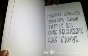 Alla partenza poi, in aeroporto abbiamo trovato un libro/ attività divertentissimo per ragazzi, dal titolo “Distruggi questo diario” (e ce ne sono altri della stessa autrice Kari Smith, come “Questo non è un libro”, “Come diventare esploratore del mondo” ecc.), con proposte veramente spiritose e creative, che si possono attuare durante il viaggio, e a Giada è piaciuto moltissimo.