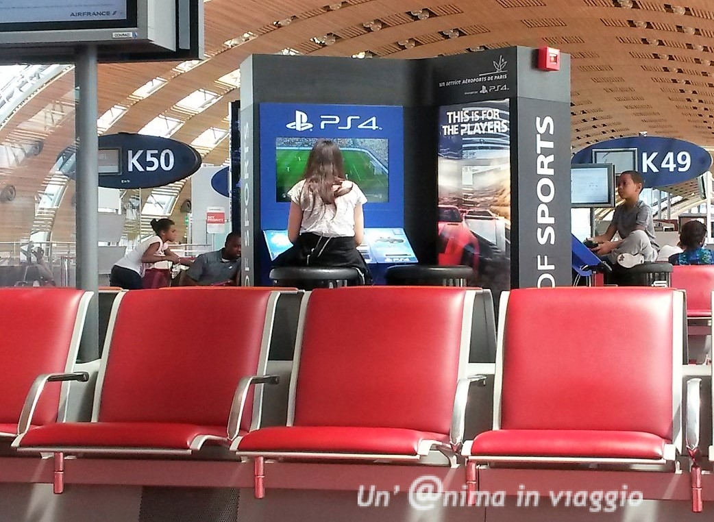Un’altra cosa che so che a lei piace, è viaggiare con un aereo grande e pieno di intrattenimenti: le ho quindi raccontato che in aereo avrebbe trovato gli schermi personali con film, giochi, ecc. e che avrebbe potuto cosi’ gustarsi anche il lungo viaggio. E cosi’ è stato! anzi ha cominciato a divertirsi già durante l’attesa del volo in coincidenza all’aeroporto di Parigi, dove ha trovato una punto con la playstation con cui giocare e sono convinta che se l’aereo avesse fatto ritardo non le sarebbe dispiaciuto!