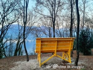 Si scende in un terreno ricoperto di ulivi, e poi lungo un bosco, ma dopo 5 minuti appare la big bench di colore giallo, che guarda il lago