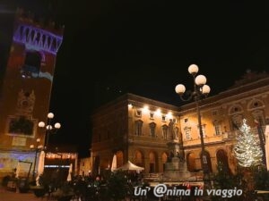 La cittadina, che è stata capitale della cultura nel 2018, ha un centro storico molto interessante: è racchiusa all’interno di mura, a cui si accede attraverso alcune porte, e non è propriamente piccola. Noi siamo entrati da una porta nel borgo fortificato, molto vicina a Piazza Leopardi, il centro cittadino (avendo trovato parcheggio nei dintorni), sede del palazzo comunale, la torre dell’orologio, dove in questo periodo ci sono le proiezione di videomapping a tema natalizio, e al centro la statua di Giacomo Leopardi