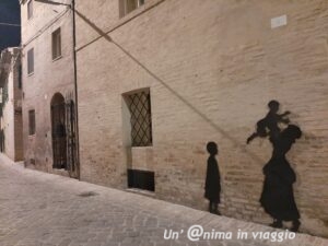 I dipinti che più mi hanno colpito sono quelli dell’artista Agis Sulaj, che puntano dritto al cuore: oltre al murales di Fellini, in Piazzetta Gabena, attorniato dai volti dei suoi personaggi con le loro espressioni caratteristiche, e il maestro che se li guarda, propone il tema dei migranti con il murales dell’ uomo con la valigia col fondo rotto, che va chissà dove..