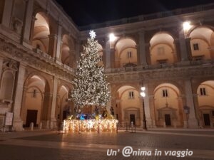 l borgo di Loreto, pieno di luci di Natale, era ancora più deserto di Recanati se possibile, tranne quando ha aperto la basilica, perché evidentemente ci sarebbe stata poco dopo una funzione.. comunque davvero bella la piazza della Chiesa, con un grande albero a un lato, e sotto un presepe, con statue a grandezza umana I