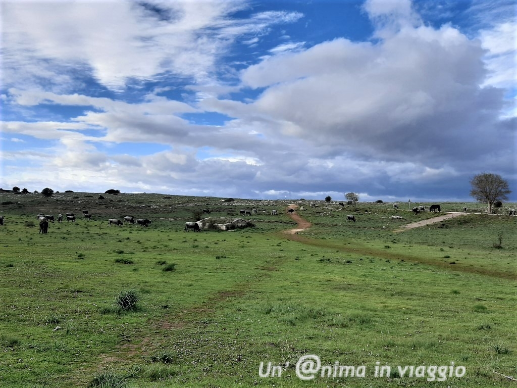 Ma l’incertezza del tempo e la possibilità di trovare terreno fangoso, mi ha fatto desistere. Per cui, puntato il navigatore, siamo arrivati al centro Jazzo Gattini, e lasciata l’auto al parcheggio, abbiamo camminato lungo l’altopiano. Dapprima a fianco a praterie, dove mucche podoliche dal manto grigio sfumato e bianco pascolavano con i loro campanacci in compagnia di qualche cavallo, poi per i sentieri, per circa un chilometro avvicinandosi alla vista della città dei Sassi.