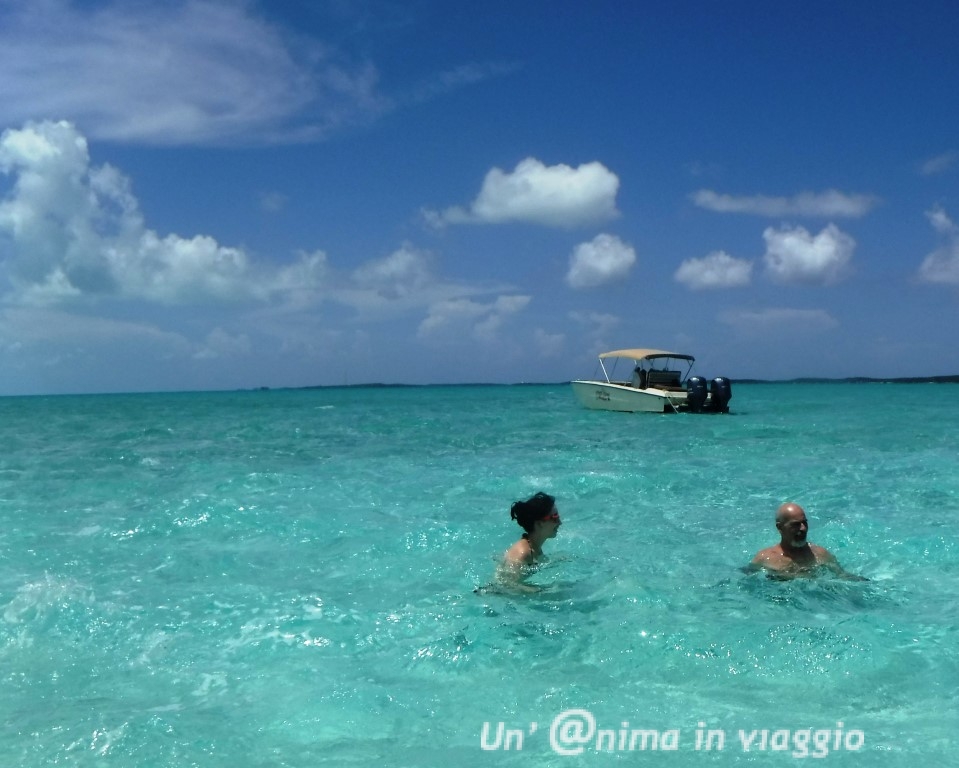 Arrivano i ragazzi che ci accompagneranno nel tour, siamo solo 9 persone, noi gli unici italiani: è perfetto!! Alle 8 si parte per gli Exuma cays, la parte di Exuma che è formata da tante piccole ed esclusive isole. Subito alla partenza ci appaiono degli isolotti lambiti da un mare con ogni sfumatura di blù e per alcuni vengono a raccontarci a chi appartengono le isole: quella è di David Copperfield, quella è di John Fry’s imprenditore americano, ecc.ecc., insomma stiamo costeggiando le isole delle celebrità.