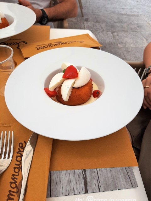 Ci siamo fermati a pranzo proprio in piazza, con la vista sul Duomo, un piccolo locale ha colto la nostra attenzione, ilBiancomangiare Bistro’ via del Convento 15: personale gentilissimo e disponibile e piatti sublimi, ovvero un cous cous alla siciliana, con gamberetti pomodorini secchi basilico e pomodori, e due arancini caprese con ripieno di mozzarella e pomodorini, e sopra colata del famoso caciocavallo ragusano.